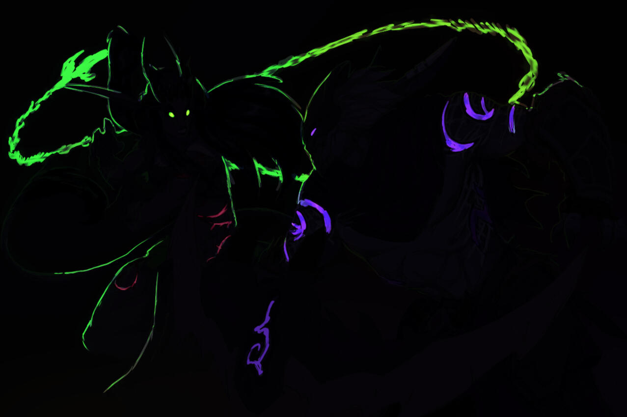 Felslinger, a scion of hollows succeeding the disgraced Archvile of Tragedy, what follows such abandon but Misery? Her ascension was a necessity, and it left the manic Eredar with a bitter quest to supersede her precursor in all ways imaginable: an infernal pyre her lord stoked with malice and jealousy.